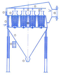 由于小顆粒的塵埃 被吸附到高效過濾筒上,這時靠智能型分配器⑧指揮脈沖閥④進行自潔反吹到錐形高效過濾筒內,把表面吸附的塵埃反吹到集塵斗⑦中,從而達到智能自潔過程。
